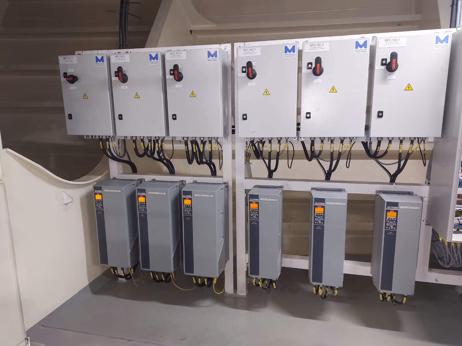 Manual bypass is standard on all EnergyOpt installations, restoring direct-on-line operation in the event of a drive fault. For critical services, automatic bypass — which engages without crew intervention — is available and recommended. Both options are evaluated in conjunction with the customer and class society based on ISO 8861 standards and existing pump or fan redundancy.